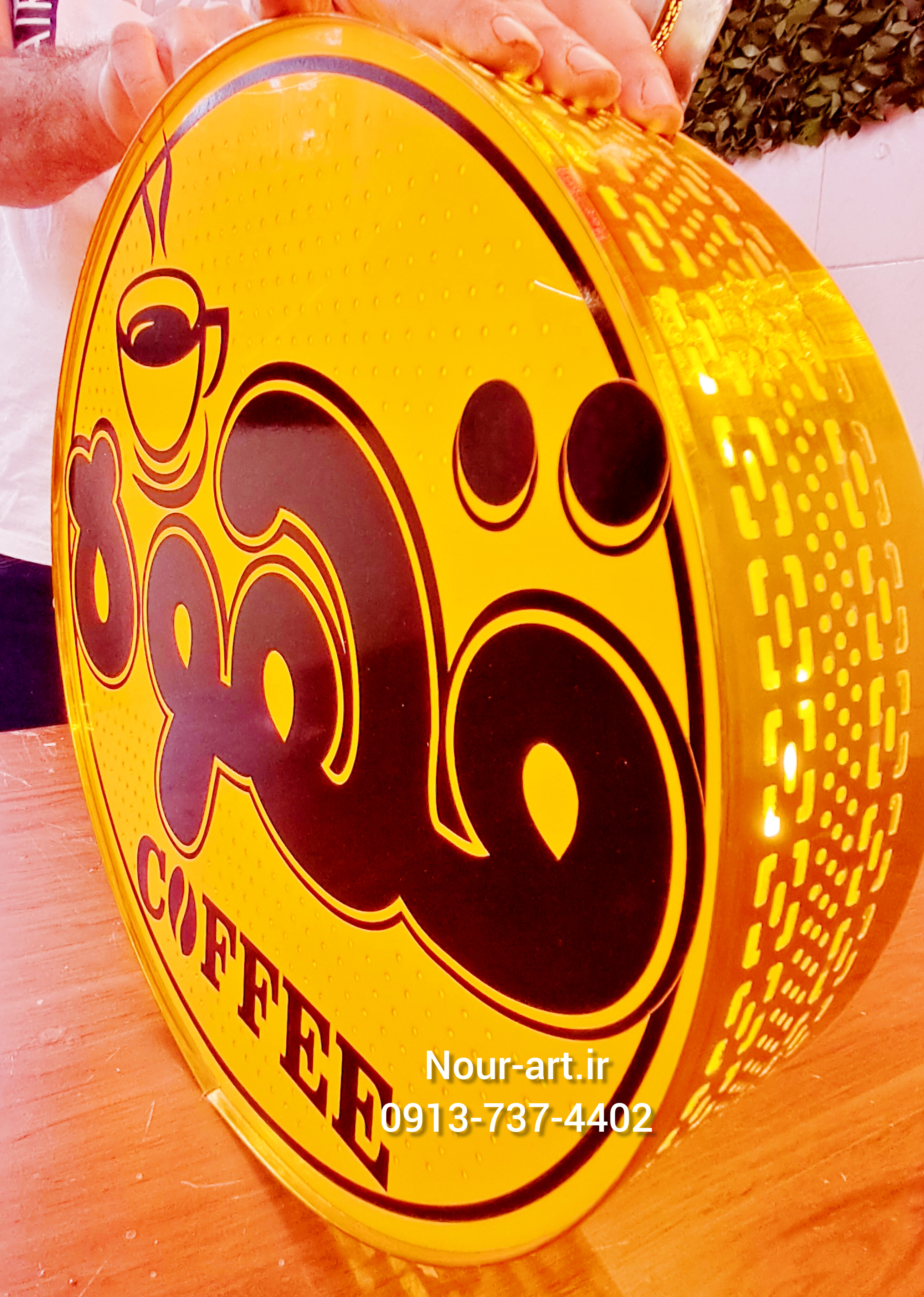 این تابلو هم تو روز قشنگه (با لبه طلایی و متن برجسته)، هم تو شب عالی میشه (مشتریارو از خیابون میکشه تو مغازه!) فضای بیرونی مغازه رو لوکس میکنه.