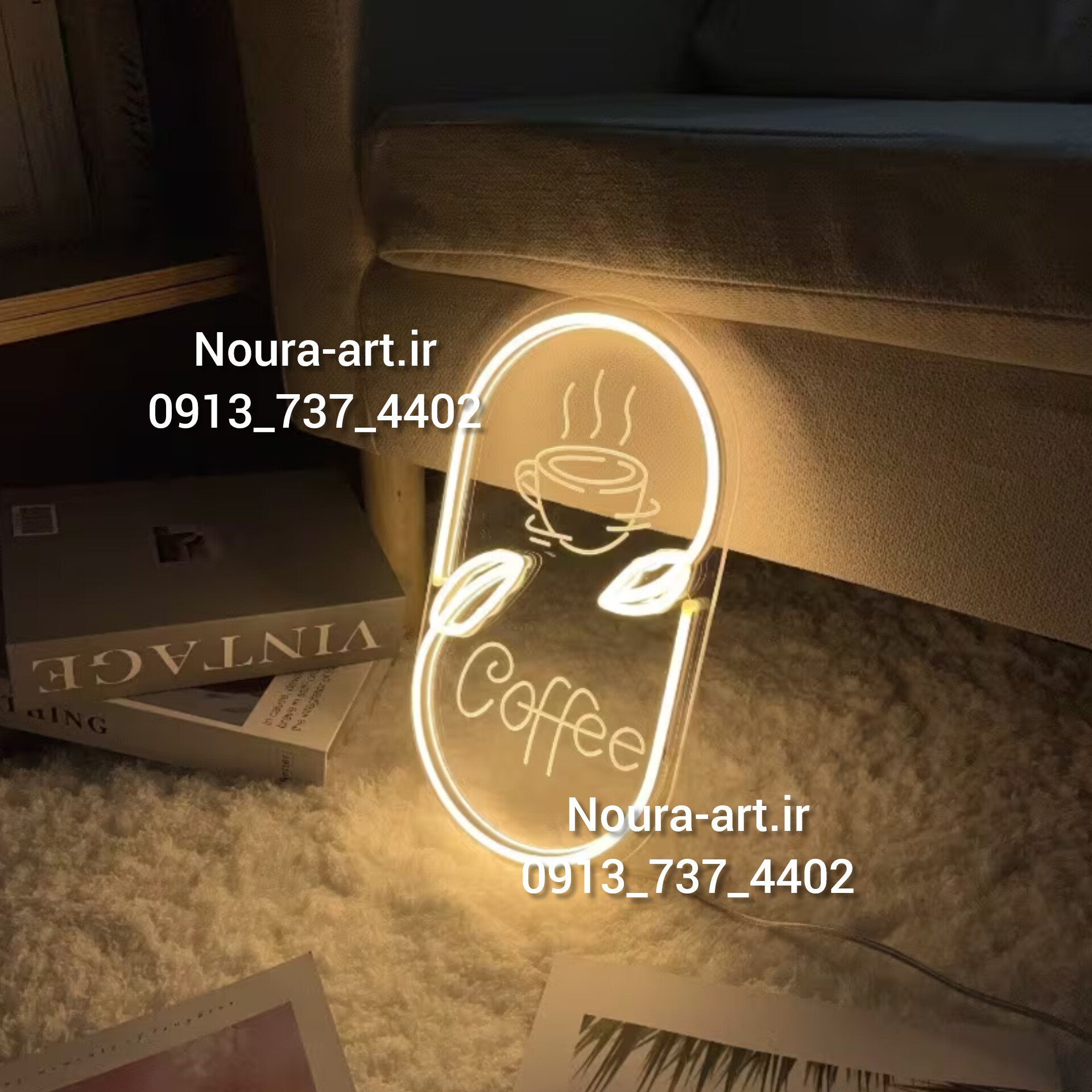فقط دایره دور شکل نئون کار شده و متن و لوگو فنجان نئونی نیستند وقتی نئون حاشیه روشن میشه نور نئون داخل فنجان و متن تابلو انعکاس میکنه و متن با نور ملایم روشن و درخشان میشه