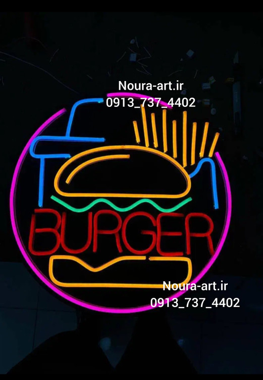 تابلو نئون طرح همبرگر هات داگ سیب زمینی فست فود اقساطی