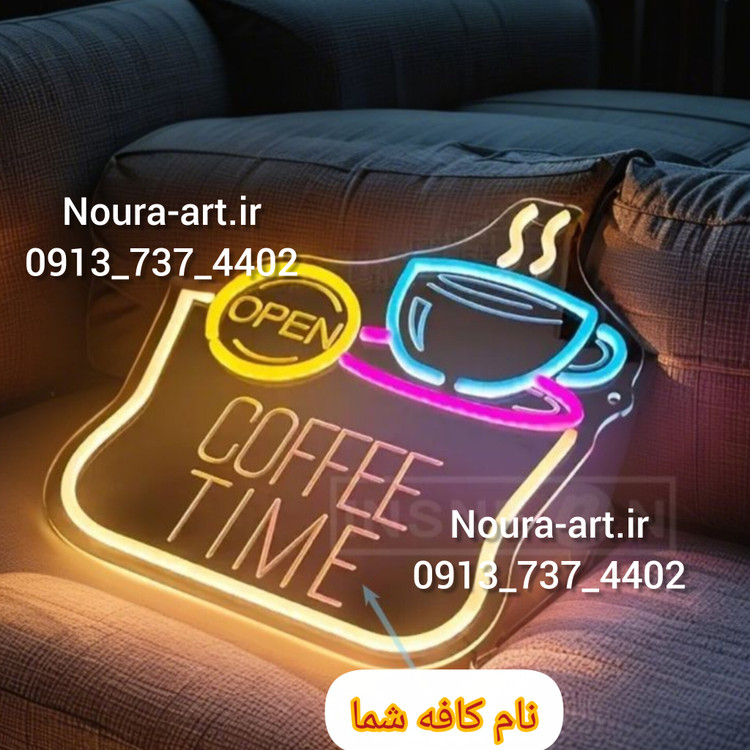 متن و لوگو در وسط تابلو نئونی نیستند متن و نوشته ها اصلا نور ندارند فقط قسمت فنجان و دایره کوچک و حاشیه کار نئون دارد
